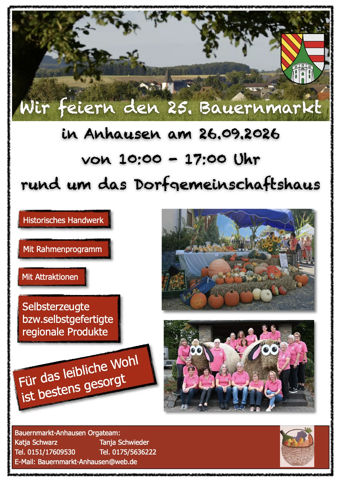 Wir feiern der 25. Bauernmarkt in Anhausen am 26.09.2026 rund um das Dorfgemeinschaftshaus