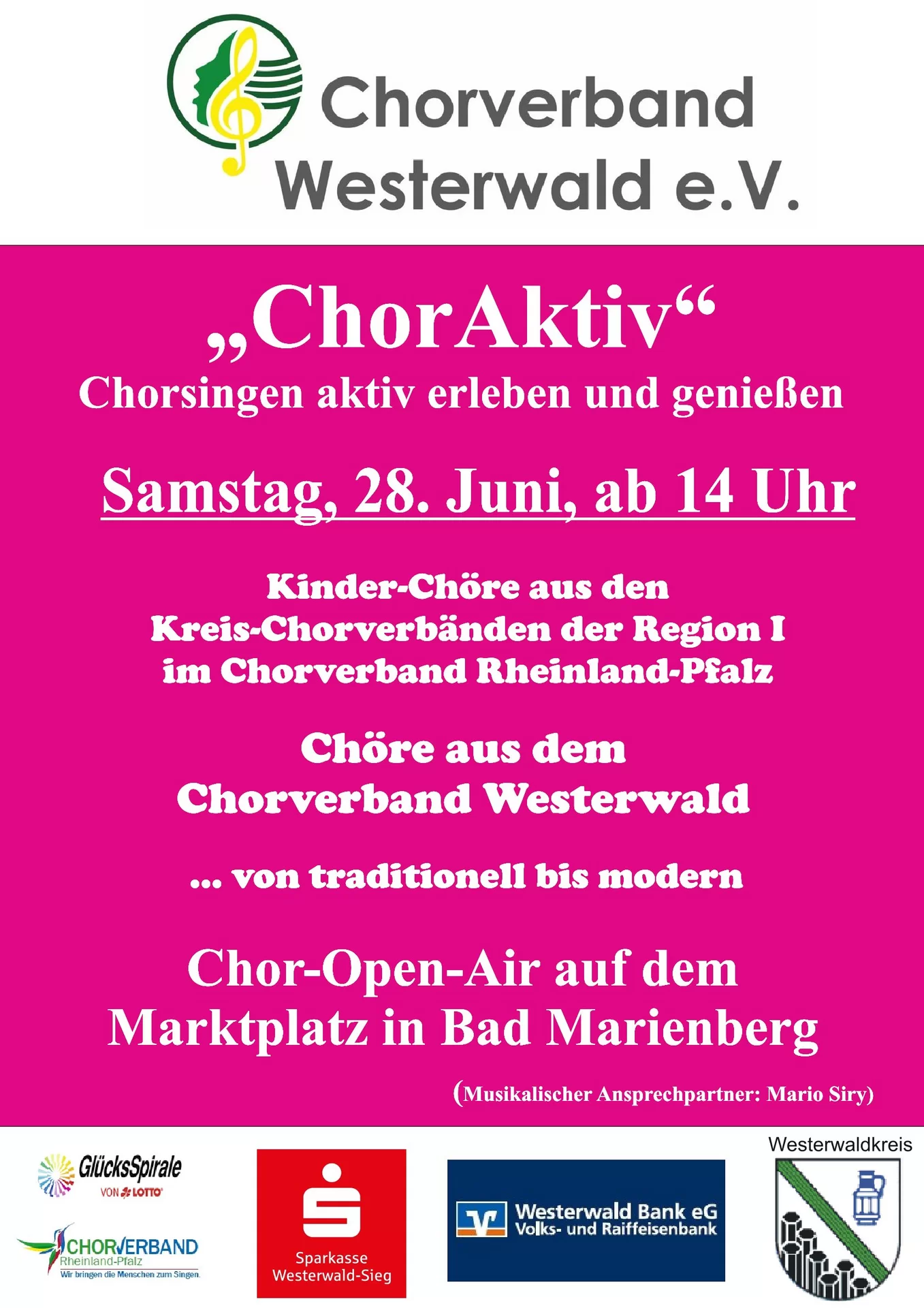 ChorAktiv 2025 – Chorsingen aktiv erleben und genießen – Open-Air-Veranstaltung des Chorverbandes Westerwald am Samstag, 28.06.2025, ab 14:00 auf dem Marktplatz in Bad Marienberg.