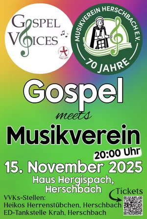 Gemeinsames Konzert von Musikverein und Gospelchor am 15.11.2025 um 20 Uhr in Herschbach im Haus Hergispach.