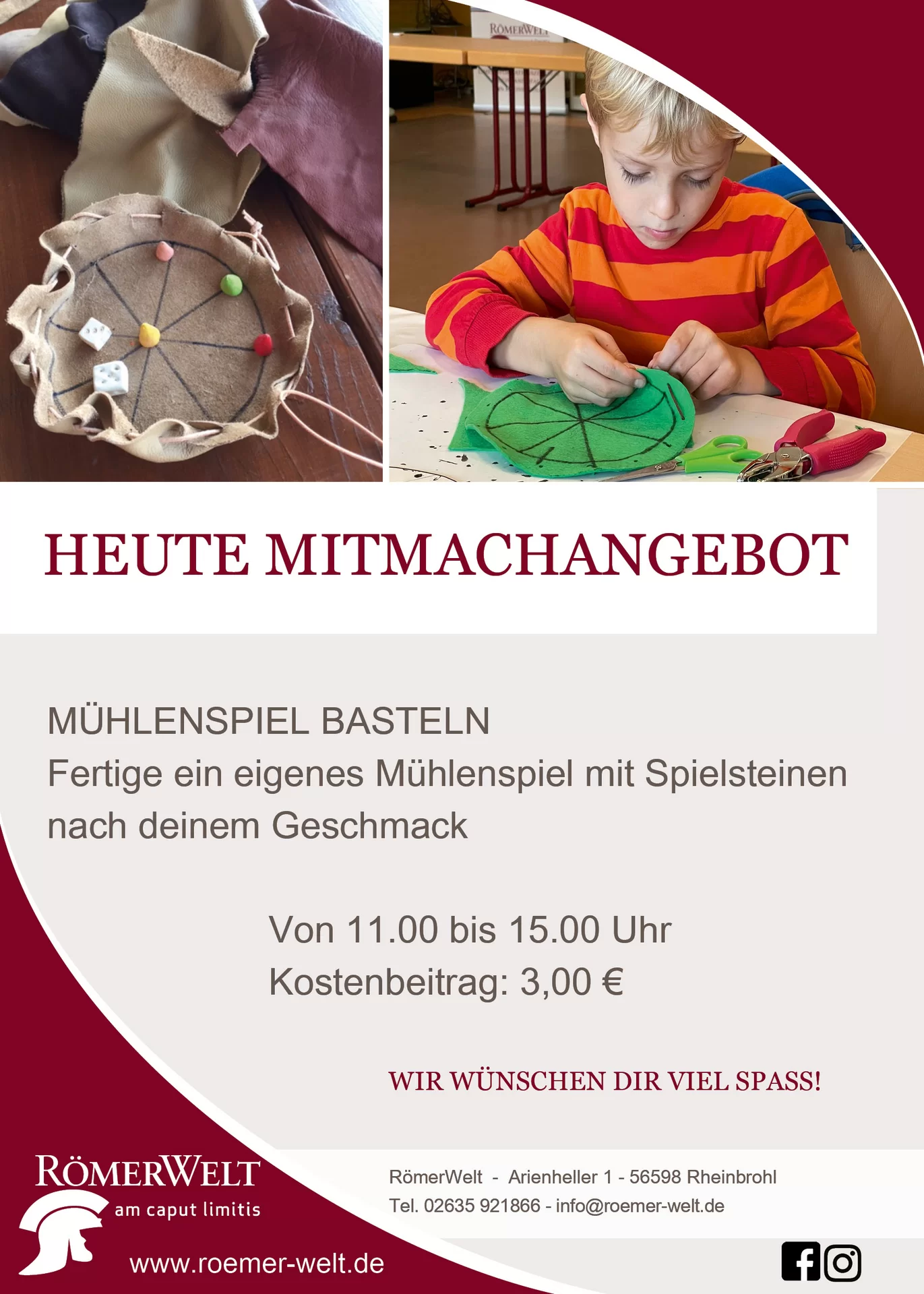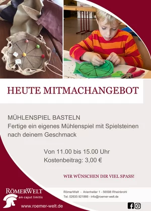 Während der Sommerzeit bietet das Erlebnismuseum RömerWelt in Rheinbrohl verschiedene Aktionen für die ganze Familie an. Heute basteln wir ein Mühlenspiel nach römischem Vorbild - natürlich zum Mitnehmen. (Materialkosten 3,00 € zzgl. Eintritt)