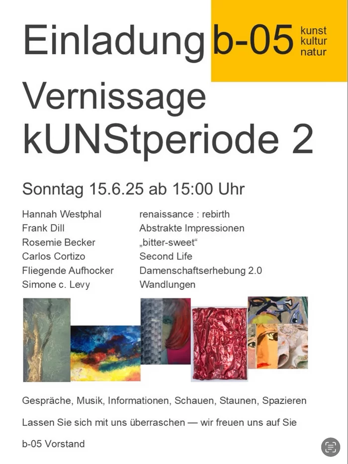 Start des Ausstellungsblocks 2 im b-05 Am Sonntag, dem 15. Juni 2025, startet um 15 Uhr der Ausstellungsblock 2 (15.06. 2025 bis 17.08.2025) auf dem Gelände des Vereins „b-05 Kunst-Kultur-Natur e.V.“ mit einer großen Vernissage.