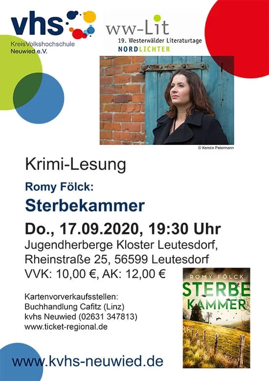 Im Rahmen der Westerwälder Literaturtage bietet die KreisVolkshochschule Neuwied am 17. September 2020 ab 19:30 Uhr eine Krimi-Lesung mit Romy Fölck an. Um in der Veranstaltung die Abstands- und Hygieneregeln zur Sicherheit aller Besucher*innen einhalten zu können, wurde die ursprünglich für Linz geplante Lesung nach Leutesdorf in den großen Saal der Jugendherberge Kloster Leutesdorf verlegt.