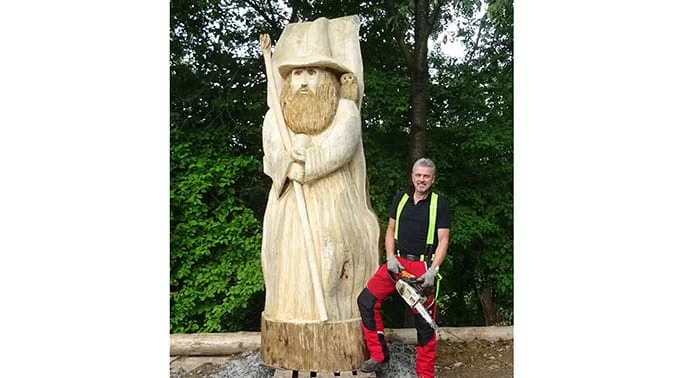 Wer ab Herbst rund um Blickhausen auf dem neuen Themenrundwanderweg „Auenlandweg“ wandert, sollte nicht überrascht sein, die eine oder andere mystische Gestalt im Wald zu treffen: Denn trotz Corona gehen die Arbeiten für das Leader-Projekt Themenrundwanderwege weiter. Darüber informiert die Kreisverwaltung. Die Wege sind bereits markiert, es fehlen aber noch Informationstafeln. Für den „Auenlandweg“ in Wissen und Mittelhof haben die Schnitzer Wolfgang Greb, Jürgen Bender und Herbert Boger bereits vor einigen Wochen mit der Arbeit begonnen. Ein regelrechtes Meisterwerk ist die Figur von Wolfgang Greb: ein 3,50 Meter hoher Zauberer wird neben anderen Figuren ab Herbst den „Auenlandweg“ schmücken.