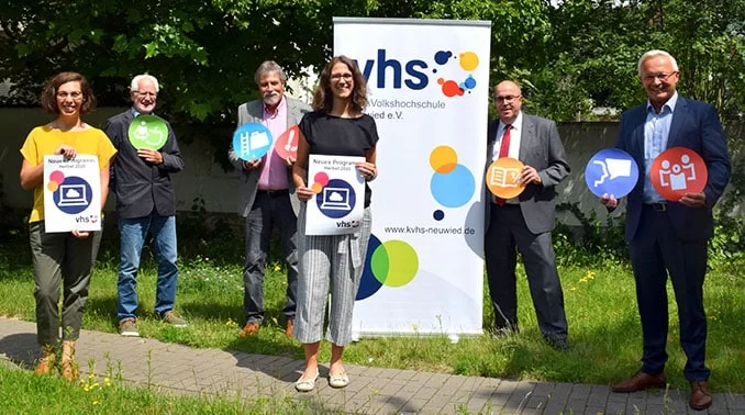 Landrat Achim Hallerbach, der Vorstand und die Geschäftsstelle präsentieren das Herbstprogramm der KreisVolkshochschule Neuwied. Nach einem turbulenten ersten Halbjahr, das von Kursabbrüchen und -ausfällen geprägt war, startet die kvhs mit neuem Elan in das zweite Halbjahr. Wegen der situationsbedingten Unwägbarkeiten in der Kursplanung verzichtet die kvhs auf ein gedrucktes Programmheft. Die Kurse werden auf der Homepage und in den Mitteilungsblättern veröffentlicht, so dass jederzeit flexibel auf Änderungen und neue Bestimmungen in Verbindung mit dem Infektionsgeschehen reagiert werden kann. Durch ein eigenes Hygienekonzept wird eine sichere Durchführung der Kurse gewährleistet.