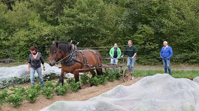 Landrat Achim Hallerbach und Jörg Hohenadl von der kreiseigenen Wirtschaftsförderungsgesellschaft, nahmen kürzlich einen tieferen Einblick in die Arbeit des Bio-Gemüseanbaus. Mit viel persönlichem Engagement und einem hohen Maß an Idealismus sind Ross & Rettich seit rund zwei Jahren in Döttesfeld landwirtschaftlich tätig und bauen über 25 Sorten Gemüse und Salate in Bioland-Qualität an. Und das nicht genug. Die Bodenbearbeitung übernehmen keine motorisierten Landmaschinen, sondern insgesamt vier Luxemburger-Ardenner Kaltblutpferde. Kein Verliebtsein in Nostalgie steckt dahinter, sondern Wissen um Bodenbeschaffenheit und deren behutsamen Umgang mit ihr.