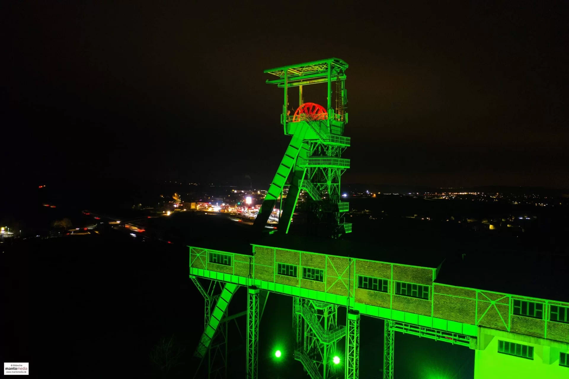 . Als eines der letzten „Überbleibsel“ der traditionsreichen Bergbaugeschichte von Westerwald und Siegerland erstrahlt nun der 56 Meter hohe Förderturm der ehemaligen Grube Georg in Willroth an der A 3 in den Abendstunden im grünen Licht. Das Industriedenkmal wird damit zu einer echten Landmarke und einem besonderen „Highlight“. Im Rahmen einer kleinen Feierstunde auf dem Betriebsgelände der Firma Georg Umformtechnik gab Bürgermeister Fred Jüngerich in seiner Eigenschaft als Vorsitzender des Fördervereins Bergbau- und Hüttentradition für den Bereich der Verbandsgemeinde Altenkirchen-Flammersfeld den offiziellen Startschuss für die Illuminaten des „stählernen Riesen“. Etliche Personen des öffentlichen Lebens, darunter Landrat Dr. Peter Enders, Dr. Andreas Reingen (Vorstandsvorsitzender der Sparkasse) und Professor Dr. Georg Wieber (Chef des Landesamtes für Geologie und Bergbau in Mainz) konnte F. Jüngerich in Willroth begrüßen. In seiner Ansprache schilderte Jüngerich den langen Werdegang, angefangen von den ersten Ideen zur Beleuchtung vor einigen Jahren durch Werner Becker (Willroth), über die Sicherstellung der Finanzierung bis hin zur heutigen offiziellen Inbetriebnahme der Illumination. Bei der Beleuchtung kam energiesparende LED-Technik zum Einsatz.