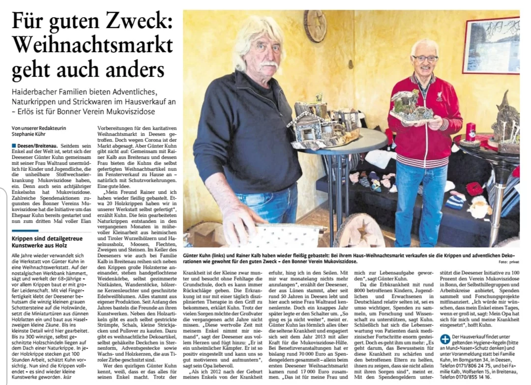 Haiderbacher Familien bieten Adventliches, Naturkrippen und Strickwaren im Hausverkauf an. Der Erlös geht an den Bonner Verein Mukoviszidose.