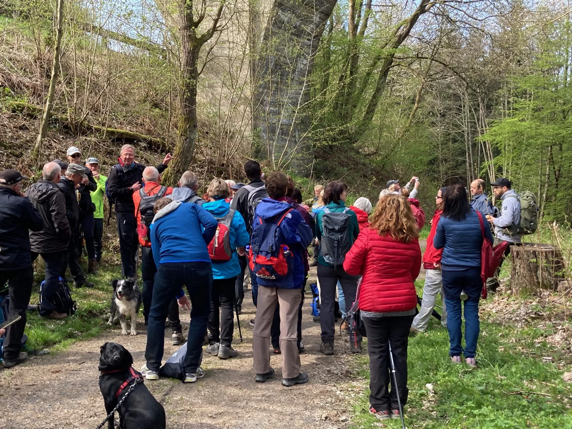 Während einige Wanderer mit Heimvorteil klimaneutral (zu Fuß) aus dem Ort „anreisten“, kamen andere von weiter her angefahren, aus acht verschiedenen Kreisen. Nach wenigen Schritten war bereits der 16 Meter hohe Stöffel-Park-Aussichtsturm erreicht. Hier bietet sich eine beeindruckende Aussicht über das gesamte Steinbruchareal und den Stöffel-Park bis hin zum Gräbersberg und weiter bis in das Tal der Großen Nister. Über Pfade, Wald- und Wiesenwege führte die Wanderung, vorbei an den beiden ältesten Bäumen der Gemeinde Stockum-Püschen, stetig bergab durch die geschichtsträchtige Gemarkung „Schmieden" und zur über 100 Jahre alten "Wasserbrücke". Sichtlich in die Jahre gekommen, erfüllt die Brücke heute immer noch ihren ursprünglichen Zweck. An der Hardter Mühle wurde die Große Nister über die Brücke gequert. Weiter ging es auf teils sehr schmalem Pfad unter der historischen Eisenbahnbrücke, einer für die damalige Zeit in Europa einmaligen architektonische Meisterleistung, hindurch in Richtung Nistertal.