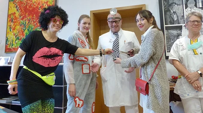 „Feiern auf Rezept“ gab es in diesem Jahr bei der Kreisverwaltung Altenkirchen. Unter dem Motto „Notruf 810 - Feiern bis der Arzt kommt“ stürmten die Möhnen der Kreisverwaltung Altenkirchen pünktlich um 11.11 Uhr das Chefarztzimmer von Landrat Dr. Peter Enders. Nach einer kleinen Stärkung wurde bereits das Können des Chefarztes und weiterer Oberärzte bei einer heiklen Stofftieroperation unter erschwerten Bedingungen getestet.