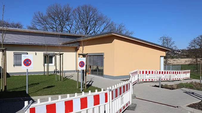 ausgewiesen auf der Parkfläche des Kindergartens. Auch der Zugang ist separiert