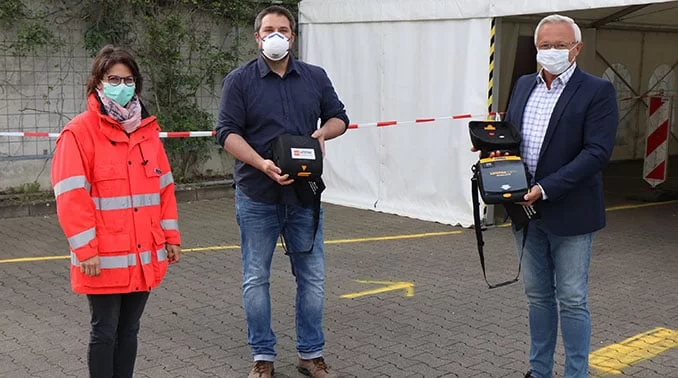 Die Ludwig-Erhard-Schule in Neuwied hat gemeinsam mit der HERZKönig Medizintechnik GmbH zwei Defibrillatoren (AED) an die Fieberambulanz gespendet. Die Geräte wurden zuvor in der Schule vorgehalten. Durch eine Erweiterung und Erneuerung der Gerätschaften, finden diese beiden Geräte jetzt in der Fieberambulanz ihren neuen Platz. „Wir sind der Schule sowie der Firma HERZKönig für die Spende sehr dankbar und können die Sicherheit in der Fieberambulanz nochmals aufwerten. Im Notfall stehen nun zwei halbautomatische Defibrillatoren zur Verfügung und ergänzen die medizinische Ausrüstung vor Ort,“ freut sich Landrat Achim Hallerbach. „Durch diese Spende können wir die ehrenamtliche Ausleihe von medizinischem Material an unsere Hilfsorganisationen zurückgeben und somit auch in diesem Bereich zu einer Entlastung beitragen,“ so der Landrat weiter.