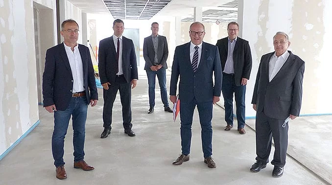 In den vergangenen Jahren hat Alho aufgrund der steigenden Nachfrage nach modularen Gebäuden und komplexer werdenden Bauaufgaben den Mitarbeiterstamm kontinuierlich ausgebaut. Daher wird das bestehende Gebäude im laufenden Betrieb aufgestockt. Anfang September werden die 15 neuen Büros inklusive Küche und Sanitärbereich bezugsfertig sein. In einem zweiten Bauabschnitt sollen noch ein Bemusterungszentrum und weitere Büroräume entstehen. „Es freut mich besonders, dass die Alho-Gruppe in dieser aktuell für viele Unternehmen schwierigen Zeit diesen Schritt geht und damit für die Region ein positives Zeichen setzt“, stellte Landrat Dr. Enders abschließend fest. Nach einem Betriebsrundgang hatte die Besuchergruppe die Möglichkeit, die neuen Räumlichkeiten zu besichtigen.