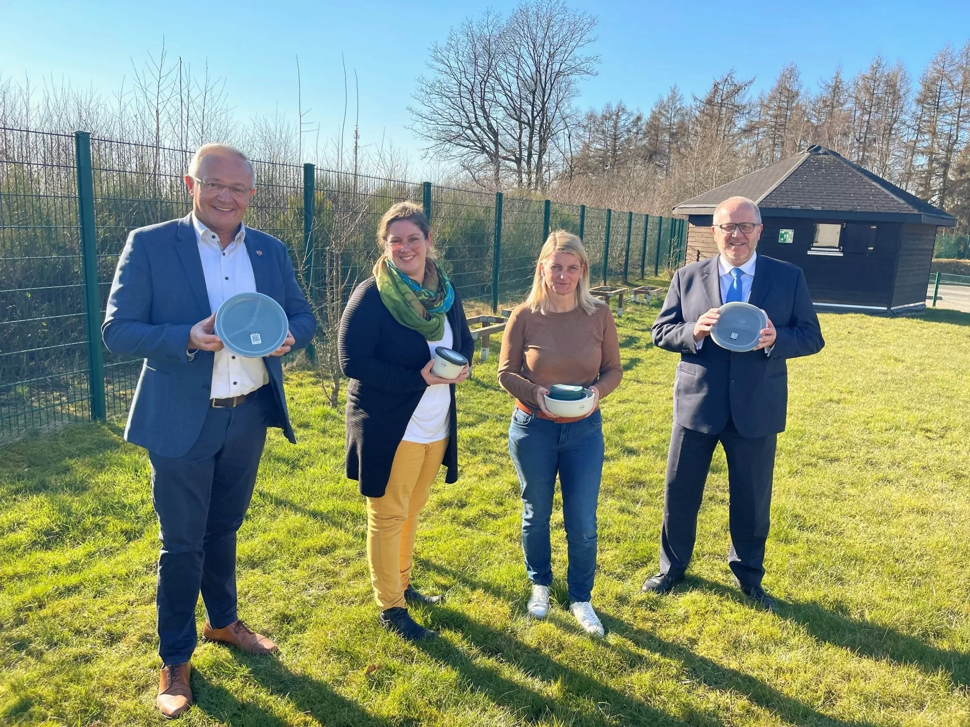 Laden gemeinsam zur Informationsveranstaltung „Mehrweg to go“ ein (von links) Landrat Achim Hallerbach (Kreis Neuwied), Gabi Schäfer von der Stabsstelle Energie, Klima und Umwelt des Kreises Neuwied, „Wir Westerwälder“-Vorständin Sandra Köster und Landrat Dr. Peter Enders (Kreis Altenkirchen). Beim Fototermin verhindert war Landrat Achim Schwickert (Westerwaldkreis).