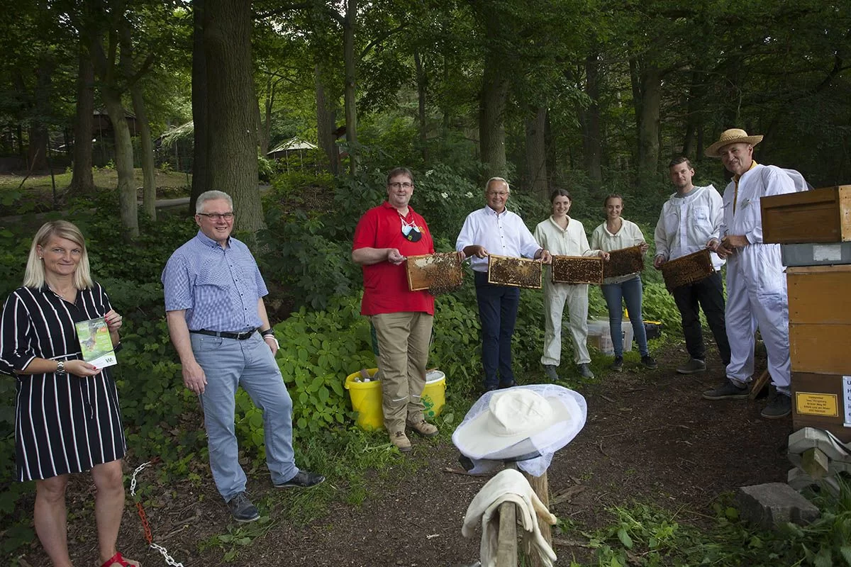 Landrat Achim Hallerbach zeigte sich von der Arbeit der Bienen als auch der Imker beeindruckt. Den beliebten Honig gibt es derzeit leider nicht im Zoo-Shop zu kaufen, weil die Frühjahrsausbeute zu gering war. Angesichts des sommerlichen Flugwetters lohnt sich das Wiederkommen. (htv)