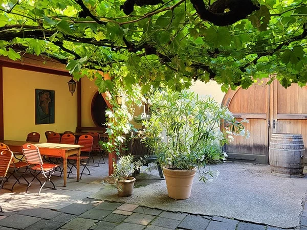 Im Reben umrankten Innenhof und weiteren Räumen des Leutesdorfer Traditionsweinguts genießen Besucher die lockere Atmosphäre zum Kennenlernen, Einkaufen und Probieren der feinen Käse- und Molkereiprodukte, wie auch der exzellenten Mittelrhein Weine der Naturgenuss-Winzer.