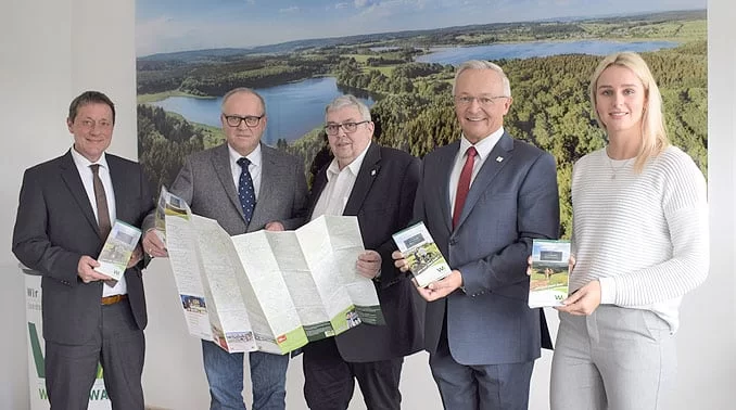 Die Landräte Achim Hallerbach (Landkreis Neuwied), Achim Schwickert (Westerwaldkreis) und Dr. Peter Enders (Landkreis Altenkirchen) präsentierten das neue Werk zusammen mit Christoph Hoopmann (Geschäftsführer Westerwald Touristik-Service) und Maja Büttner (Stellv. Geschäftsführerin).