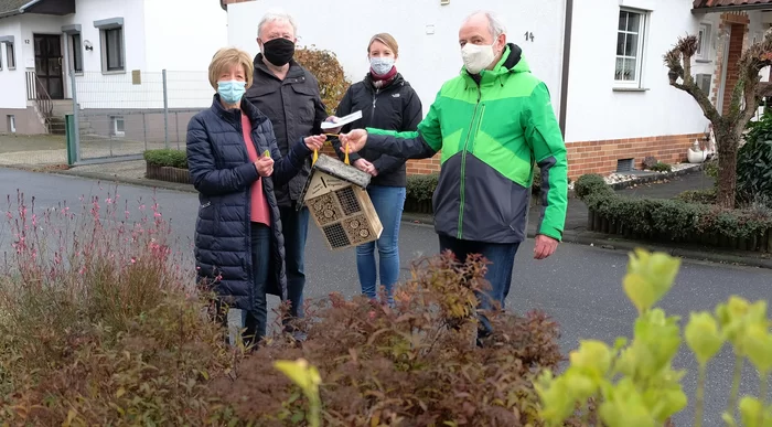 (Zum Foto: Wolfgang Rahn (rechts), Sprecher der Lokalen Agenda, und Alena Linke (2. von rechts) von der Stadtverwaltung übergaben ein Insektenhotel und einen Gutschein an Helmut und Martina Schmitz. Hinweis: Die Fotos entstanden vor dem harten Lockdown)