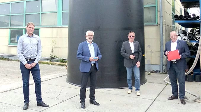Beim sich anschließenden Betriebsrundgang konnte man dann in Augenschein nehmen, worüber vorher am Bürotisch gesprochen wurde: Meterhohe Kunststoffbehälter in runden und eckigen Formen, die zuvor in einer hochinnovativen Produktionsumgebung von kompetenten Facharbeitern zusammengeschweißt wurden. „Beim Anblick dieser Produkte wird einem klar, dass hier keine Massenproduktion stattfindet, sondern jeder Behälter für sich ein Einzelstück darstellt. Dieser hohe Innovationsgrad dürfte sicherlich mit ein Grund sein, warum sich Ihr Unternehmen schon so lange am Markt bewährt", äußerte sich Bürgermeister Schneider abschließend in Richtung Olejnik und wünschte ihm für die Zukunft auch weiterhin viel Erfolg.