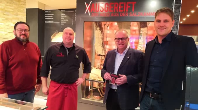 „Bei der Art und Weise, wie Dirk Schmidt über seinen Betrieb und seinen Beruf redet, wird deutlich, wie viel Leidenschaft und Innovationsbereitschaft dahinter steckt“, sagt Landrat Dr. Peter Enders, der gemeinsam mit Lars Kober, Leiter der Wirtschaftsförderung und Sebastian Dürr, Regionalmanager der Leader-Region Westerwald-Sieg, das Unternehmen besuchte. Auf die Frage des Landrates, wie er sich in Zeiten der Globalisierung und des stetig zunehmenden Wettbewerbsdrucks am Markt halten kann, antwortet Schmidt mit mehreren Schlagworten: „Qualität, Regionalität, gute Mitarbeiterinnen und Mitarbeiter, modernes Marketing und individuelle Produkte verbunden mit dem Angebot von Grillseminaren sind die Säulen, auf denen unser Unternehmen steht.“ Schaut man sich den Kundenkreis an, der nicht nur aus heimischen und qualitätsbewussten Privatpersonen besteht, sondern auch Unternehmen und Behörden umfasst, scheint das Geschäftsmodell aufzugehen.