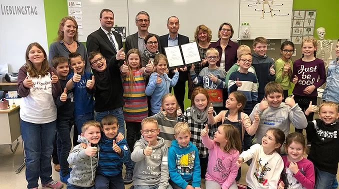 Mit einem Zuschuss in Höhe von knapp 25.000 Euro erhält die UNESCO-Projektschule Norken im Westerwaldkreis als erste Schule in Rheinland-Pfalz eine Förderung aus dem DigitalPakt Schule, der in Rheinland-Pfalz seit Ende September über die Investitions- und Strukturbank Rheinland-Pfalz (ISB) umgesetzt wird. Die rheinland-pfälzische Bildungsministerin Dr. Stefanie Hubig überreichte gemeinsam mit Dr. Ulrich Link, Mitglied des Vorstandes der ISB, den Förderbescheid an Simone Jungbluth, Bürgermeisterin der Ortsgemeinde Norken, und die kommissarische Schulleiterin Melanie Hannappel.