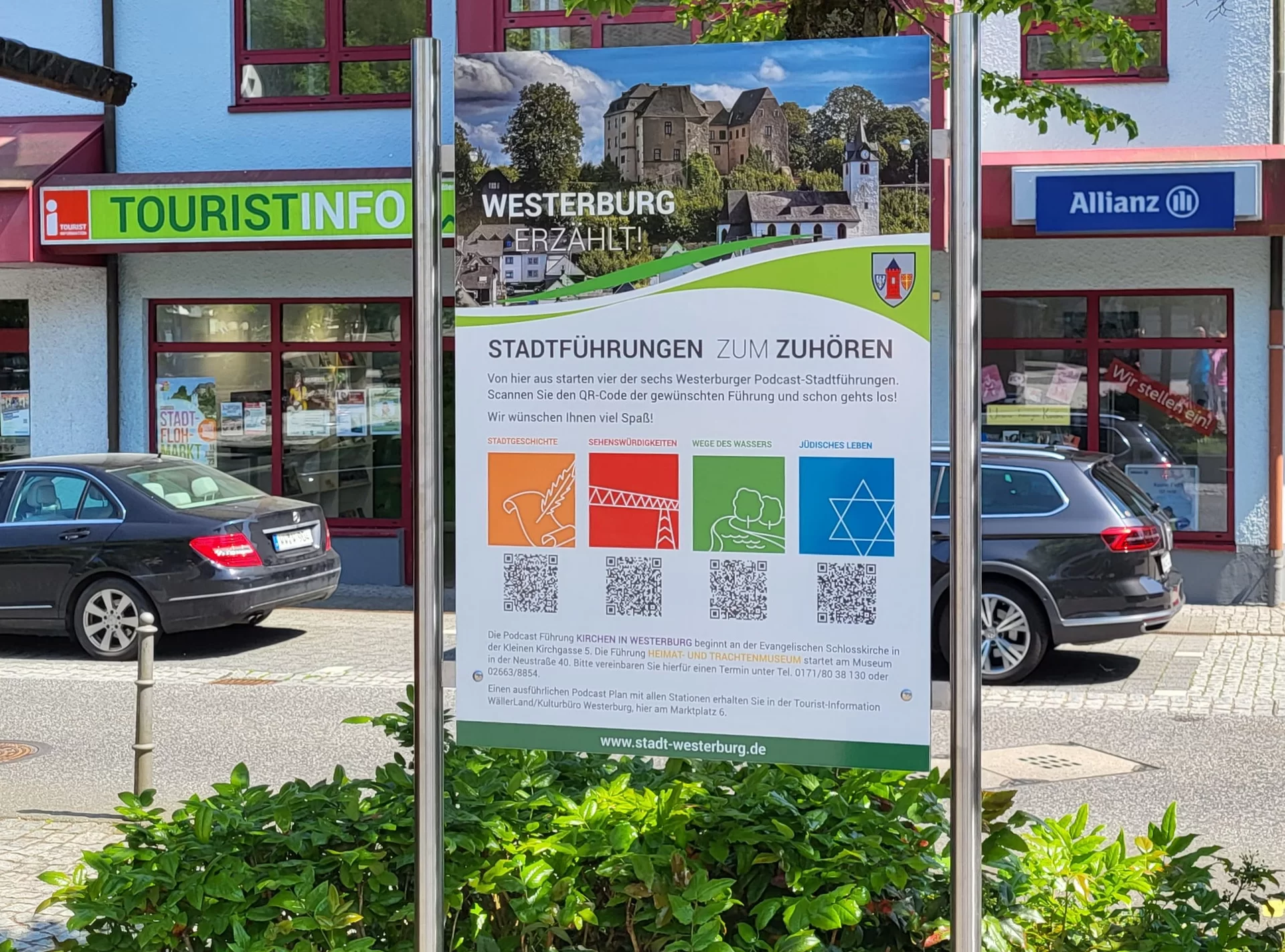 Wer in Westerburg eine Stadtführung unternehmen möchte, der kann nun zusätzlich zu den regelmäßig angebotenen Stadtführungen spontan sowie zeit- und ortsunabhängig das Angebot der Podcast-Führungen nutzen. Sechs verschiedene Themenwege gibt es zu entdecken. Ausgangspunkt fast aller Routen ist der Alte Markt, wo ein Schild den Hinweis auf die Podcast-Führungen gibt.
