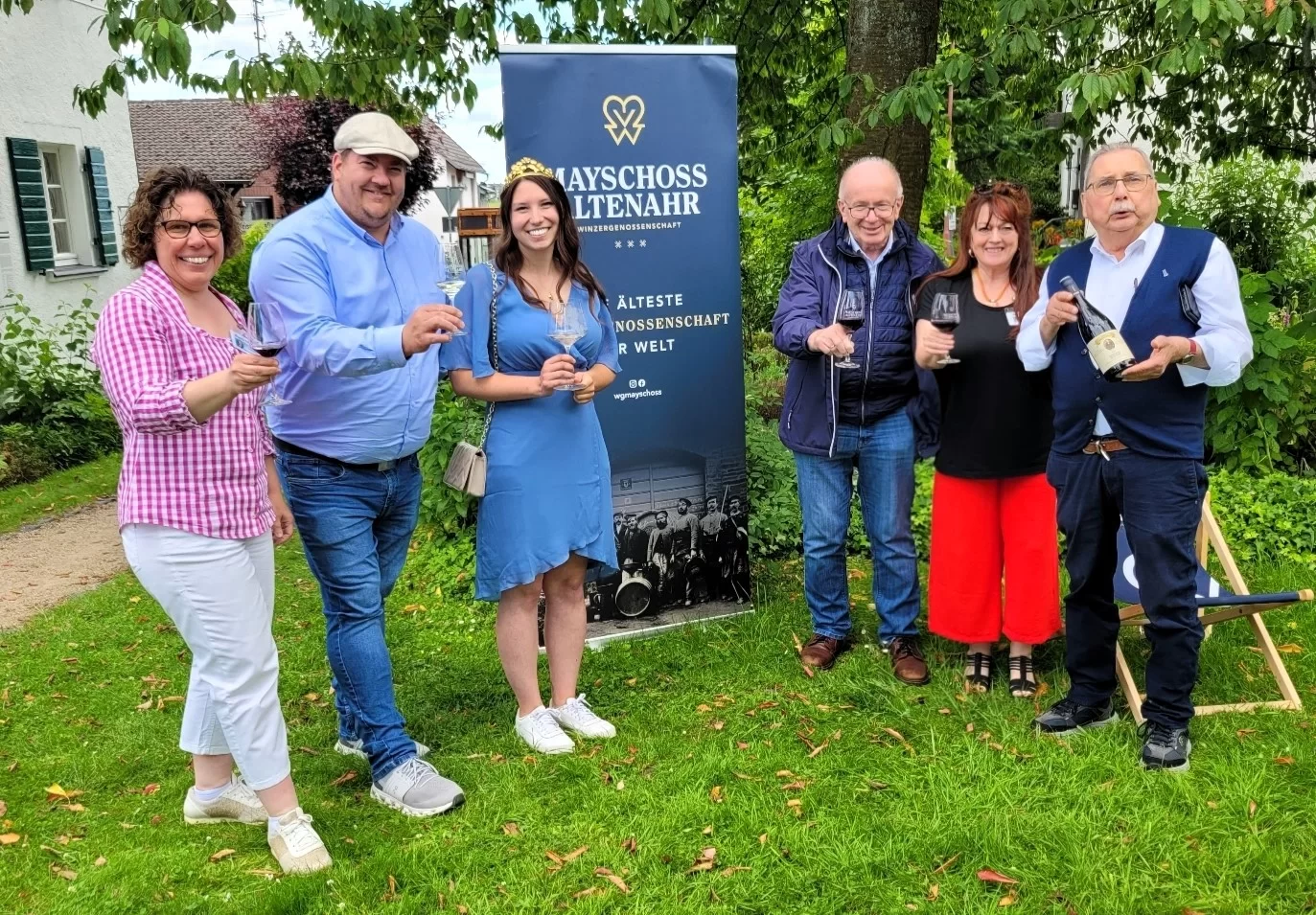 Zu einem Wein-Treff der ganz eigenen Art wurde der schöne Garten des Raiffeisenhauses in Flammersfeld. Die älteste Winzergenossenschaft der Welt, Mayschoß-Altenahr, hatte gemeinsam mit der Tourist-Info der Verbandsgemeinde Altenkirchen-Flammersfeld im Rahmen der Raiffeisenwoche zur Weinverkostung eingeladen. Die Besucher genossen mit den guten Weinen aus dem berühmten Rotweinanbaugebiet auch den geselligen und gemütlichen Garten des Raiffeisenhauses unter den schattigen Bäumen.Mit von der Partie waren ebenso der Weyerbuscher Brodverein e.V., der sein mobilen Backes mit frischem Raiffeisen-Brot präsentierte. Dieses duftete nicht nur gut, sondern schmeckte auch mit verschiedenen Aufstrichen sehr lecker. Frischen Flammkuchen gab es aus dem Raiffeisen-Backes, den Geo Hillen (Flüchtlingshilfe Flammersfeld) mit einem Team junger Flüchtlinge backte. Das Raiffeisenhaus war ebenfalls geöffnet und die Raiffeisenbotschafterinnen Julie Georgis und Anette Neitzert hatten keine Langeweile. In Vertretung von Bürgermeister Jüngerich konnte Beigeordneter Rolf Schmidt-Markoski als besondere Gäste die Mayschosser Weinkönigin Jule Streich, den stellvertretenden Vorsitzenden der Winzergenossenschaft Mirco Burkardt sowie den Flammersfelder Ortsbürgermeister Manfred Berger und Raiffeisenfan Christoph Lange aus Witten begrüßen. Weinkönigin Jule repräsentiert für ein Jahr das alte Weindorf Mayschoß und seine edlen Produkte, die in der Welt der Genießer seit langem höchste Anerkennung finden. Der Ur-Ur-Großvater Marius Müller des umtriebigen Raiffeisen-Fans war zu Zeiten Raiffeisens Pfarrer in Flammersfeld. Lange ist auch Mitinitiator der „Friedrich W. Raiffeisen-Wein-Edition“ der Winzergenossenschaft, die an den Genossenschaftsgründer und Sozialreformer und dessen Lebensstationen erinnert. Schmidt-Markoski dankte in seinem Grußwort allen Akteuren, besonders den Mitarbeiterinnen der Tourist-Info Martina Beer und Angela Metzen. Er zog ein positives Fazit und hielt eine Neuauflage im kommenden Jahr nicht für ausgeschlossen.