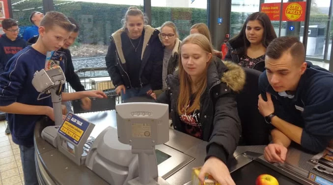 Der Besuch bei ALDI SÜD zeigte, dass zum Aufgabenspektrum in einer Filiale deutlich mehr gehört, als nur „Waren über das Band zu ziehen“. Die vorgestellten Zahlen und Fakten zu dem meist verkauften Produkt, dem günstigsten Produkt oder dem anfallenden Papier- und Verpackungsmüll beeindruckten und überraschten Jugendliche wie Begleitpersonen. Frau Carina Arndt informierte außerdem über die vielseitigen Ein- und Aufstiegsmöglichkeiten bei ALDI SÜD. Bei praktischen Übungen an einer Simulationskasse konnten die Schülerinnen und Schüler erfahren, wie anspruchsvoll eine Tätigkeit im Einzelhandel für Körper und Geist ist. Sie möchten auch einmal Gastgeber einer Exkursion sein, oder als Bildungseinrichtung an dem kostenlosen „Rund um sorglos“ Paket der Wirtschaftsförderungsgesellschaft teilnehmen? Dann wenden Sie sich gerne an Beate Bolling unter beate.bolling@westerwaldkreis.de oder an Marvin Kraus unter marvin.kraus@westerwaldkreis.de.