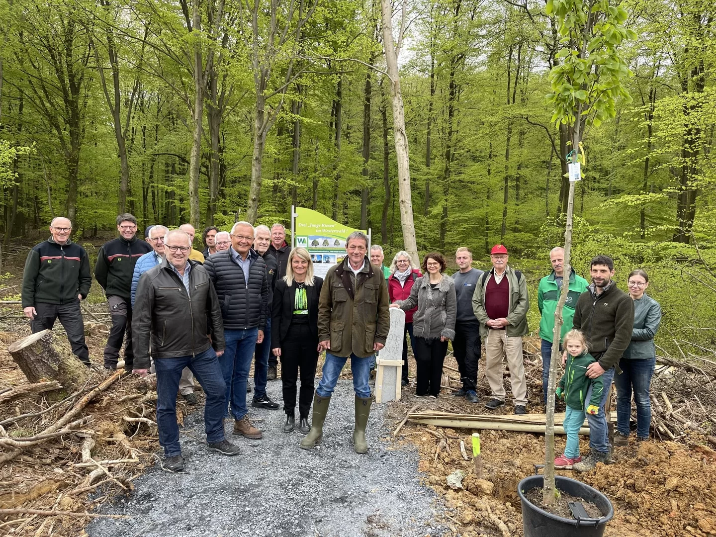 Die Bäume stammten vom Pflanzenhof Schürg in Wissen und sind „Junge Riesen“. Die Stiftung „Natur & Umwelt Rheinland-Pfalz“ hat zusammen mit der Forschungsanstalt für Waldökologie und Forstwirtschaft Saatgut von Naturdenkmälern – „Alten Riesen“ – gesammelt und diese vermehrt. So stammen die Setzlinge von der „Alten Linde“ in Hilgenroth (AK) ab. „Sie sind zehn Jahre alt und sehen noch klein und verletzlich aus. Doch ich hoffe, sie entwickeln sich in der Zukunft auch zu echten Riesen. Der Wald hat es nötig“, machte Achim Hallerbach in seiner kurzen Ansprache deutlich und ergänzte: „Denn auch hier sehen wir da, wo früher Fichten standen, viel Kahlschlag. Meine politische Position in diesem Zusammenhang ist eindeutig: Bei aller Sympathien für erneuerbare Energien und der Notwendigkeit, diese auszubauen: Wir brauchen den Wald! Diese Brachflächen müssen wir forstwirtschaftlich entwickeln“, bekräftigte Hallerbach.