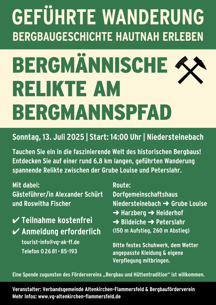 Startpunkt der rund dreistündigen Wanderung ist um 14:00 Uhr das Dorfgemeinschaftshaus in Niedersteinebach (56593). Unter der Leitung des Gästeführers Alexander Schürt und der Gästeführerin Roswitha Fischer entdecken die Teilnehmer entlang des Bergmannspfads eindrucksvolle Spuren der industriellen V