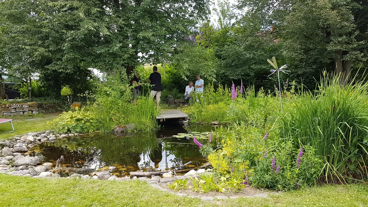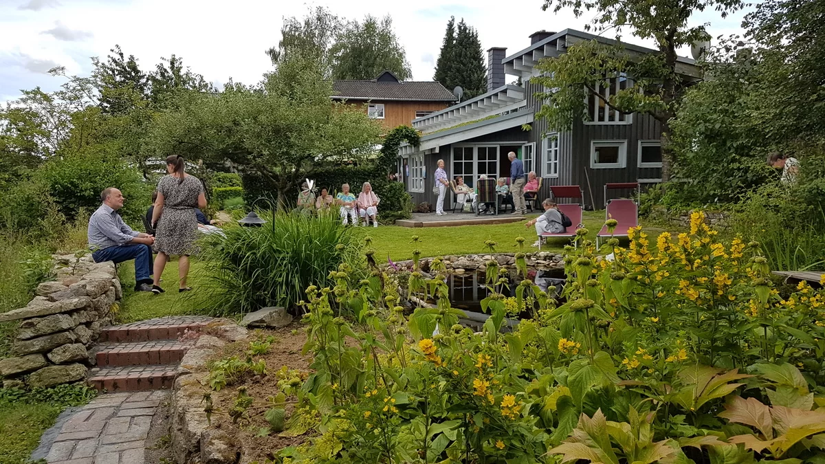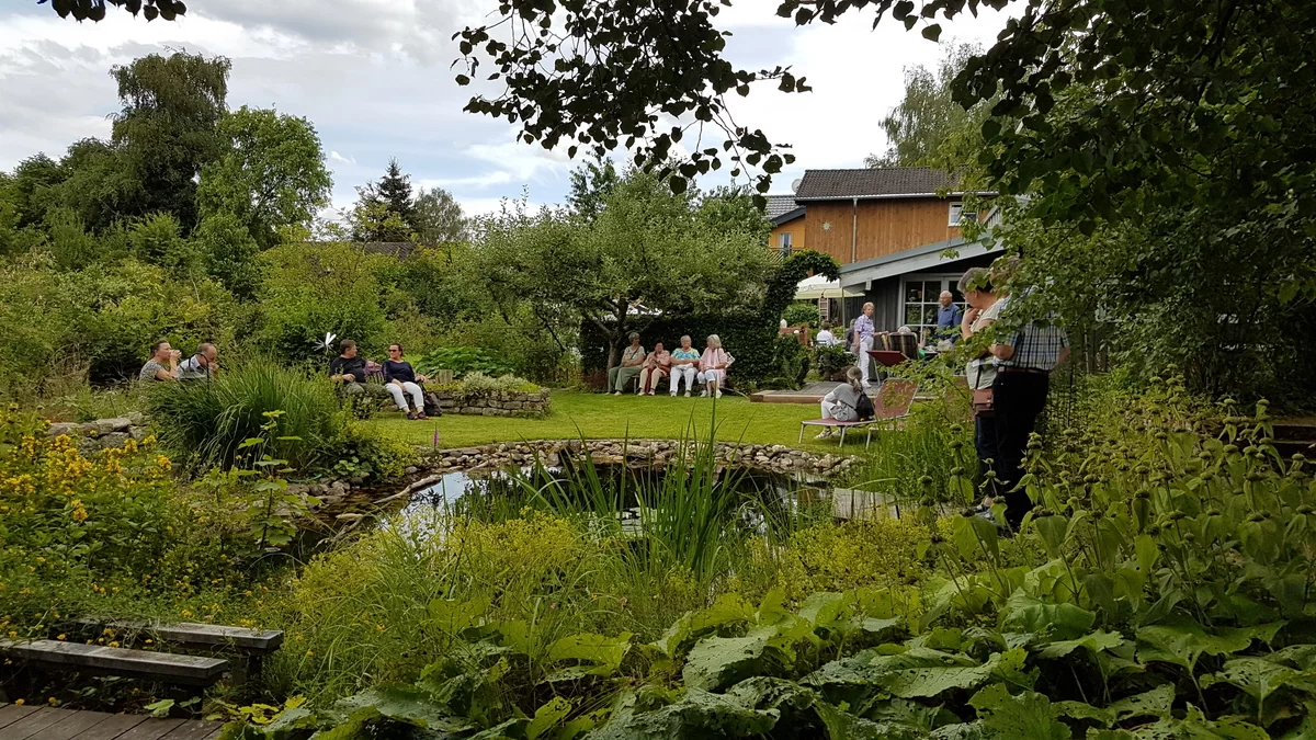 Der über 50 Jahre alte Garten beeindruckt mit altem Baumbestand und rustikalem Charme durch Naturstein-Trockenmauern, Treppen und Pflasterungen. Fassaden- und Dachbegrünung fördern Ökologie, ein Nutzgarten dient der Selbstversorgung. Gartenteich und Ferienhaus ergänzen die Ruhe und Nachhaltigkeit.