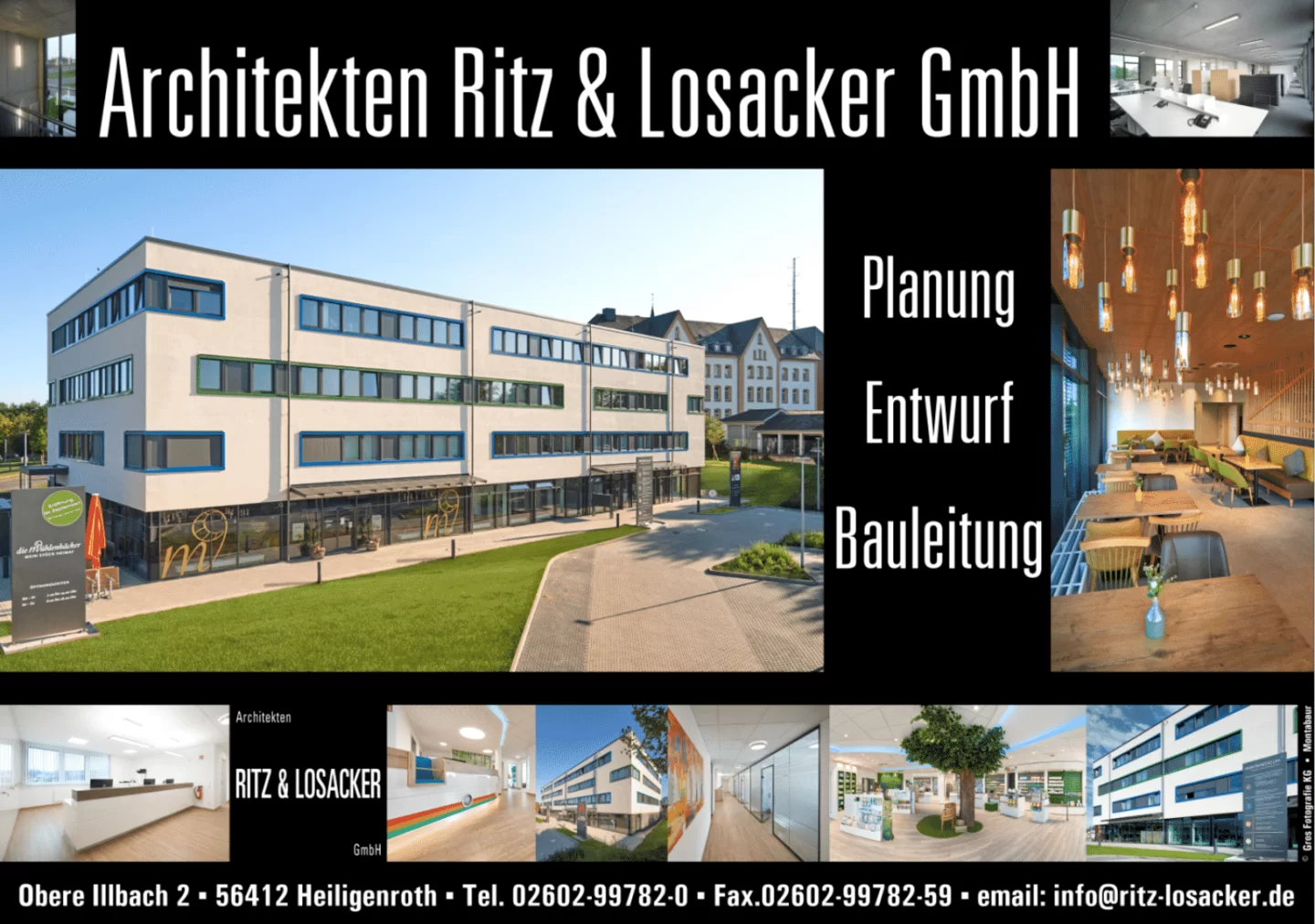 Das Architekturbüro Ritz & Losacker wurde im Jahr 1997 durch die gleichberechtigten Partner Matthias Losacker und Ansgar Ritz gegründet. Im Jahr 2004 erfolgte dann die Gründung der Architekten Ritz & Losacker GmbH mit den Standorten Weilburg (Hessen) und Heiligenroth (Rheinland-Pfalz). Bürostandort in Heiligenroth: Obere Illbach 2 56412 Heiligenroth Tel.: 02602/997820 Bürostandort in Weilburg: Frankfurter Straße 13 35781 Weilburg Tel.: 06471/5164470 Die Architekten Ritz & Losacker GmbH besteht neben den beiden Partnern aus weiteren angestellten Architekten, Bauleitern, Bauzeichnern sowie kaufmännischen Mitarbeitern, die projektbezogen in Ihren jeweiligen Schwerpunktgebieten teamorientiert eingesetzt werden. Bei komplexen Bauaufgaben verfügt unser Architekturbüro über ein Netzwerk aus Fachingenieuren, mit denen flexible, auf die Bedürfnisse der Bauherren zugeschnittene, Dienstleistungskooperationen gebildet werden können. Mit großem Engagement bilden wir auch zukunftsorientiert aus und ermöglichen so Auszubildenden, Absolventen und Praktikanten Perspektiven in den verschiedenen Aufgabengebieten des Berufsbildes.