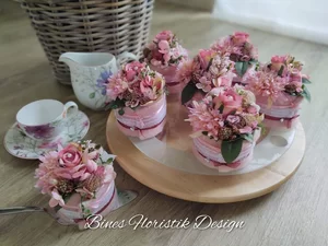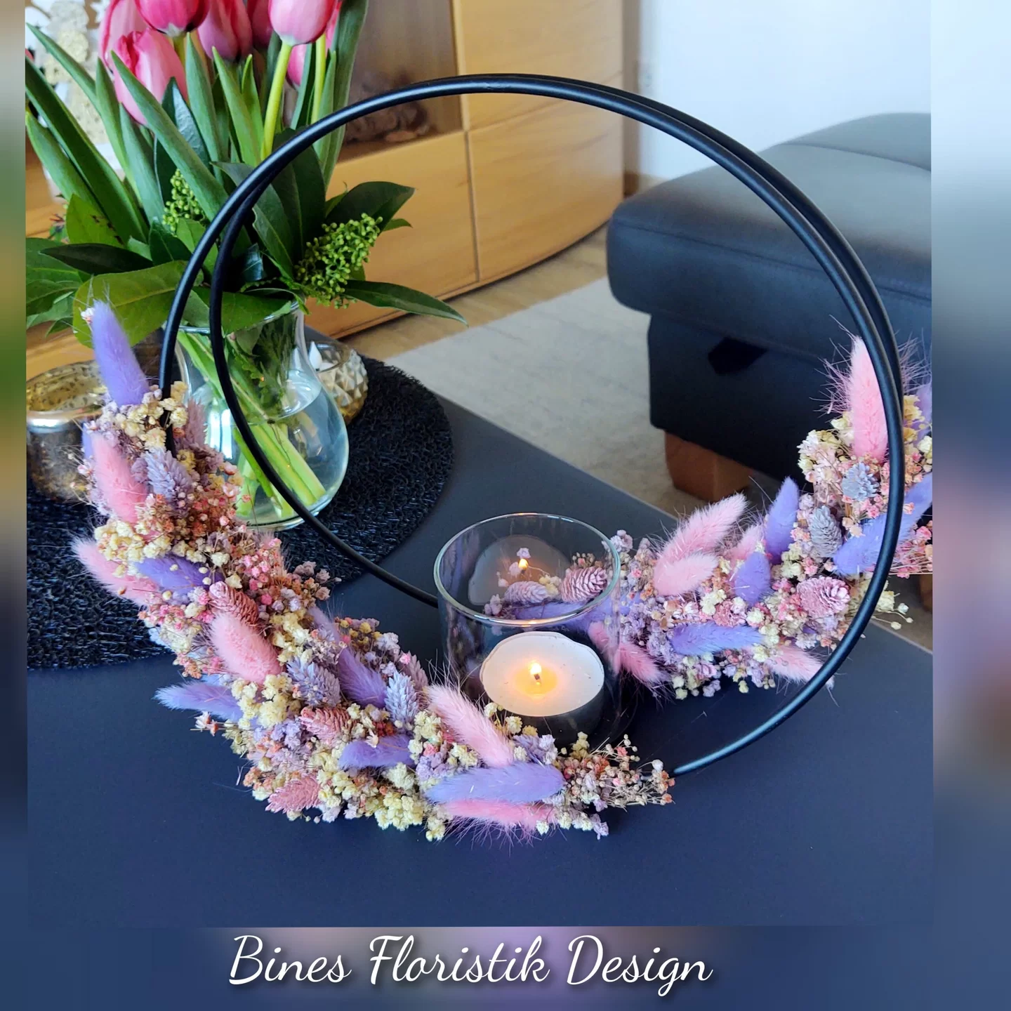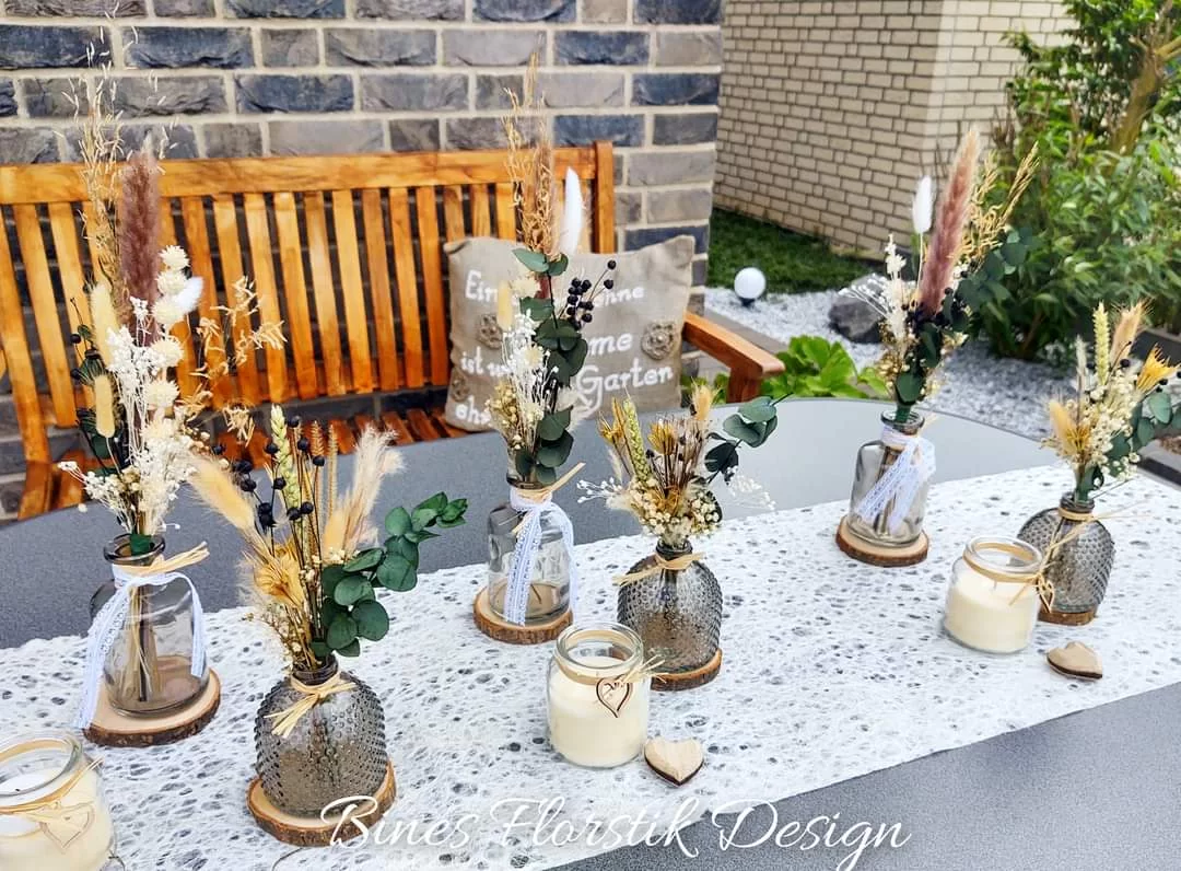 Hierzu nutze ich ausschließlich Kunst- und Trockenblumen, da diese jahrlang begeistern und zudem pflegeleicht sind. Perfekt in Szene gesetzt wirken die Werkstücke täuschend echt.