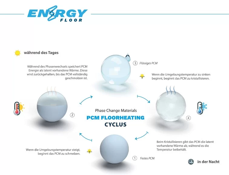 Energy floor (PCM) – Cronatherm GmbH Energy floor: Eine Kombination aus Energiespeicher und Fußbodenheizung in einem! Mit der Verwendung von PCM (Phase Change Materials) bieten wir eine effiziente Lösung für die Speicherung und Nutzung von Energie in Wohn- und Gewerbegebäuden. Unser Produkt ermöglicht es, Energie zu speichern und sie dann bei Bedarf effizient für die Beheizung und Kühlung von Räumen zu nutzen. Durch die Kombination von Energiespeicher und Fußbodenheizung in einem System bieten wir nicht nur eine Platz- und kostensparende Lösung, sondern auch eine nachhaltige Alternative für umweltbewusste Kunden.