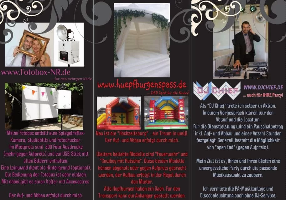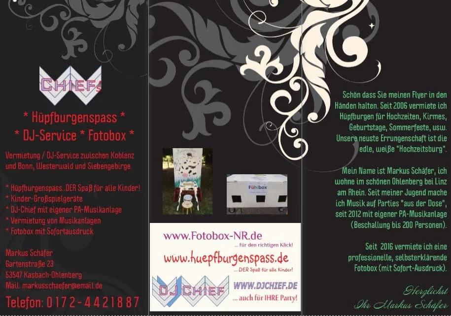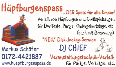 Wir vermieten für Ihre Hochzeit, Feier, Party, Geburtstag, Karnevalsparty, Dorffest oder Kindergeburtstag: * bunte und weiße HÜPFBURGEN als Kinderbelustigung * MUSIKANAGEN (PA) mit diversem Discolicht / Effekten * Ambiente - WANDSTRAHLER für indirekte Beleuchtung * professionelle FOTOBOX mit Foto-Direkt-Ausdrucken Zudem bieten wir folgende Dienstleistungen an: * DJ-SERVICE mit passender Musikwahl und Moderation * BEAMER mit LEINWAND für KARAOKE oder Vorträge * SEIFENBLASENMASCHINE und diverse Effekte * Beratung zu LOCATION, DEKO und ZELTVERMIETUNG Wir sind für Sie da in den PLZ-Gebieten 50, 51, 53, 56. Gerne erwarten wir Ihre Anfrage. Ihr Markus Schäfer & Team