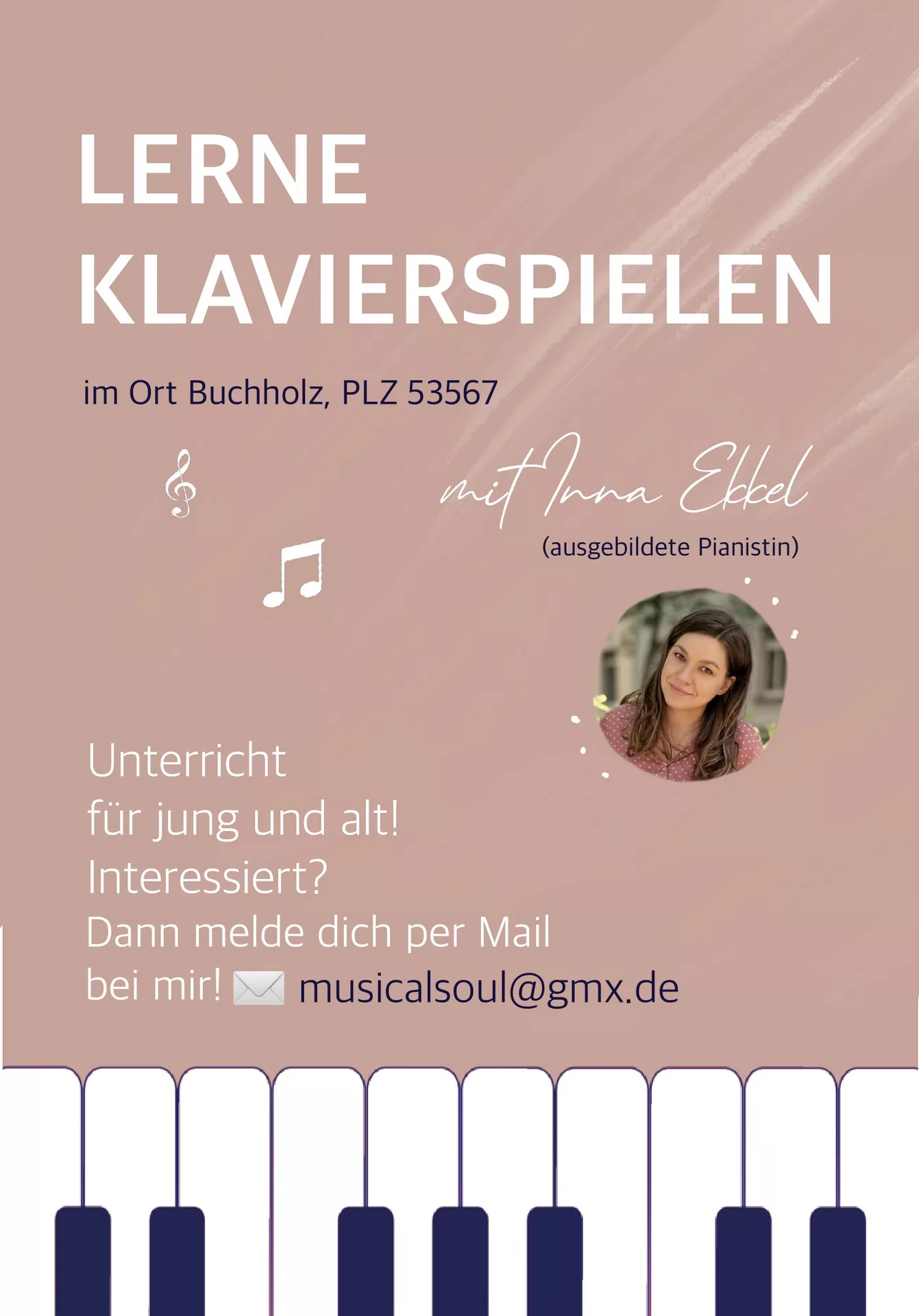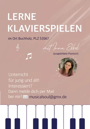 Klavierunterricht für jung und alt von professionelle Klavierlehrerin. Der Unterricht wird gemeinsam nach eigenem Anspruch, musikalischen Vorlieben und Vorstellungen gestaltet (Filmmusik, Game-Musik, Klassik, Pop, Jazz, etc.). Inhalte können beispielsweise sein: -Stücke für einen besonderen Anlass einstudieren -Stücke nach Gehör spielen -Notenlesen lernen -gemeinsam zu komponieren -vor allem ganz viel Freude an der Musik! Meine persönlichen Stärken, wie Kreativität, Geduld im Umgang mit Kindern sowie Erwachsenen und Leidenschaft für Musik bringe ich in jede Klavierstunde ein. Ich strebe immer danach, jeden einzelnen Schüler musikalisch zu entwickeln.Flexibler Termin nach Vereinbarung möglich, auch zwischen Ferienzeit und Feiertagen! Der Unterricht findet bei mir Zuhause statt! Preise: -25€ / 30min -30€ / 45min -35€ / 60min Falls ich euer Interesse geweckt haben sollte, meldet euch doch gerne per E-Mail: musicalsoul@gmx.de Ich freue mich von euch zu hören.