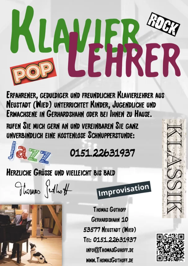 Thomas Guthoff ist ein erfahrener, geduldiger und freundlicher Klavierlehrer. Er unterrichtet Kinder, Jugendliche und Erwachsene in seinem Studio in Gerhardshahn oder bei Ihnen zu Hause in den Sparten Klassik, Rock, Pop, Improvisation, Theorie und Gehörbildung. Bitte vereinbaren Sie ganz unverbindliche eine kostenlose Schnupperstunde. Thomas Guthoff studierte Klavier und Kirchenmusik an der Folkwang Hochschule für Musik in Essen.