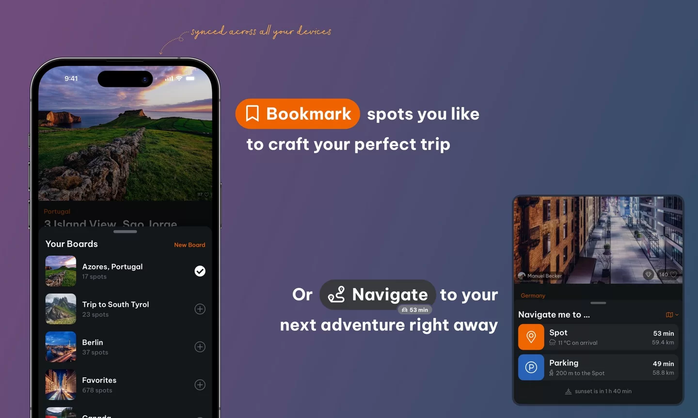 Find spots around you or your travel destination in real-time and never miss the best views again with our iOS and Android app. Get navigated directly or check nearby spots with their distances, routes and travel times to get there in time for a beautiful sunset.