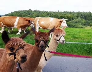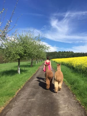 Mit Alpakas wandern durch den Westerwald ... … ist immer ein besonderes Erlebnis. In entspannter Atmosphäre machen Sie sich mit Ihrem Alpaka auf den Weg durch die faszinierende Natur des Westerwalds. Egal, ob Sie sich für ein Trekking mit unseren Jungs entscheiden, lieber nur ein bisschen spazieren möchten, Sie erleben magische Momente. Die Trekkingtouren finden ganzjährig und meist am Wochenende statt. Die Tour dauert ca. 2,5 Stunden. Zunächst erfahren Sie einige wissenswerte Dinge über das Wesen unserer Alpakas und den Umgang mit diesen kleinen, freundlichen Kamelen. Sie erhalten von uns einen kleinen Snack für unterwegs und lernen die kleine Herde in Ruhe kennen. Sind alle Fragen beantwortet, erhält jeder sein Tier, dann laufen wir los. Die Tiere bestimmen maßgeblich unser Tempo, sodass wir vorher nicht genau wissen wie viele Kilometer wir zusammen gehen (maximal 5 km). Ca. in der Hälfte des Weges machen wir eine kurze Rast. Hier haben Sie Gelegenheit nach Herzenslust Fotos zu machen, etwas zu trinken und Ihren Snack zu verzehren. Zurück am Stall dürfen Sie Ihr Tier mit einem Schüsselchen Müsli belohnen und es dann, nach ausgiebigem verabschieden, selbstständig auf die Wiese entlassen. Bevor Sie die Heimreise, mit vielen neuen Eindrücken im Gepäck, antreten wartet noch eine kleine Überraschung auf Sie. Neben den Trekkingtouren bieten wir auch Schnuppertour, die 1,5 Stunden dauern, an. Menschen die nicht laufen wollen oder können heißen wir herzlich zu einem Alpaka hautnah willkommen.
