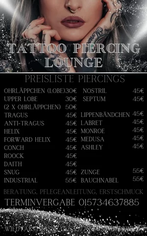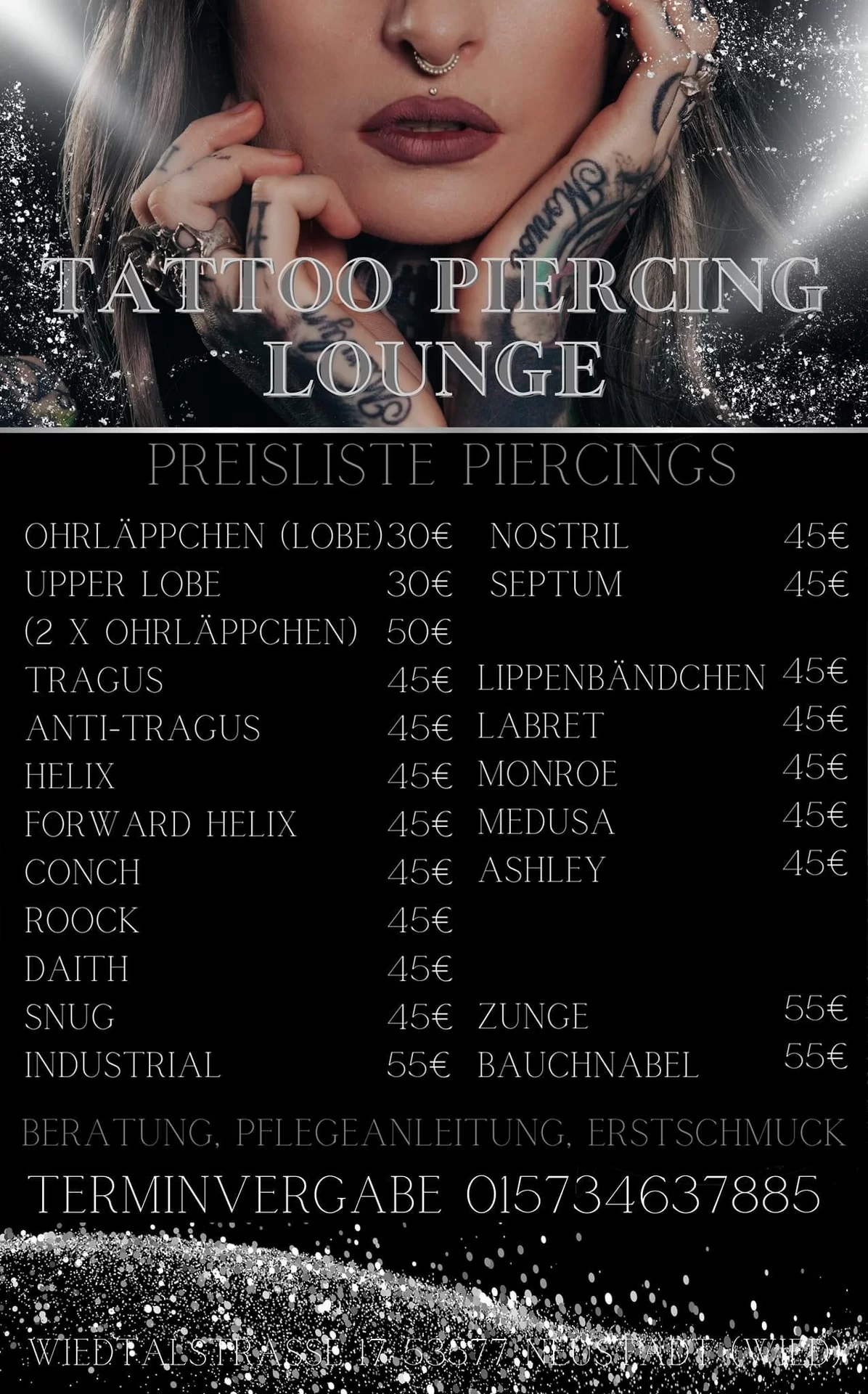 Herzlich Willkommen in der Tattoo Lounge, wir bieten bereits seit 2012 unsere professionellen Dienstleistungen im Bereich Tattoo, Piercing, Permanent Make Up und Haarverlängerungen an. Bei uns wird jeder Kunde individuell beraten und wir bieten top Arbeit zu fairen Preisen. Die Einhaltung der gesetzlich vorgeschriebenen Hygienemaßnahmen sind für uns selbstverständlich. Wir haben keine fixen Öffnungszeiten, sondern vereinbaren Termine flexibel nach Absprache mit unseren Kunden. Terminvergabe unter 0173 46 37 885 Wir freuen uns auf Euren Besuch Eure Tattoo Lounge